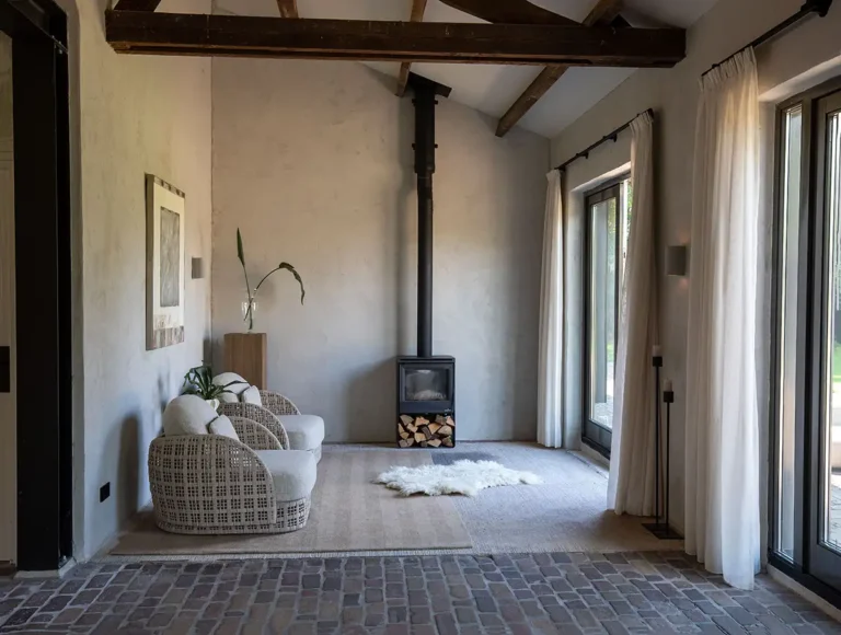 De ruimte wordt verwarmd met twee houtkachels, die zorgen voor een aangename warmte en een sfeervolle uitstraling.